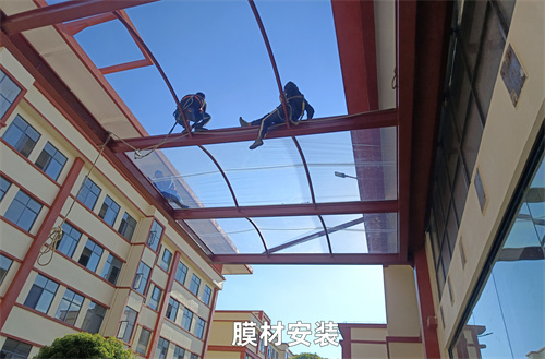 膜結(jié)構(gòu)的安裝施工方法通常有以下步驟:基礎(chǔ)準(zhǔn)備→支撐構(gòu)件(鋼結(jié)構(gòu))的制作、施工、安裝→膜材的制作、安裝與清洗。